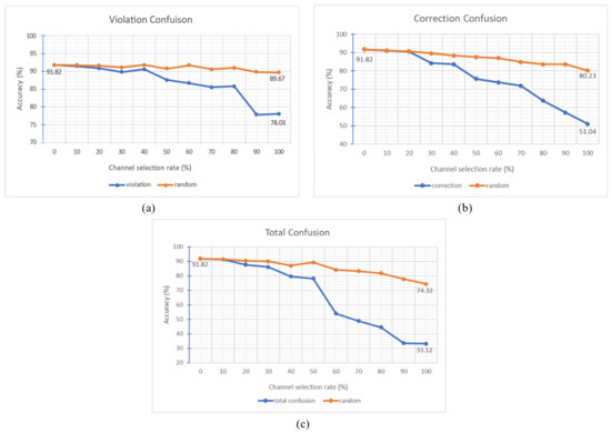 Additionally, we checked the effect of each graph by performing a random selection on each type of confusion graph. We randomly turn off as many as x% of channels in each graph and leave (100 − x)% of channels in each graph alone. For example, 0% selection on violation graph means that none of the channels in the graph got zero-values, and 90% attack means that we choose 14 × 0.9 = 12.6 ≈ 12 channels in the graph to be zeroed out and leave the remaining two channels with their own values. Thus, the larger x is, the more channels are deleted. We also compare the results with random channel deletion for the same amount of deletion.