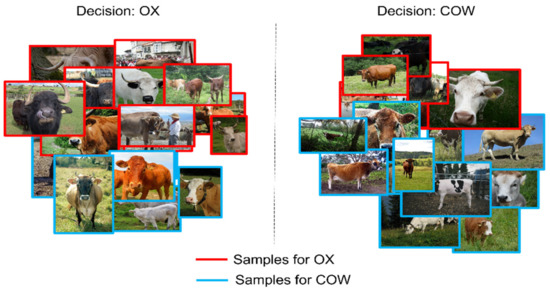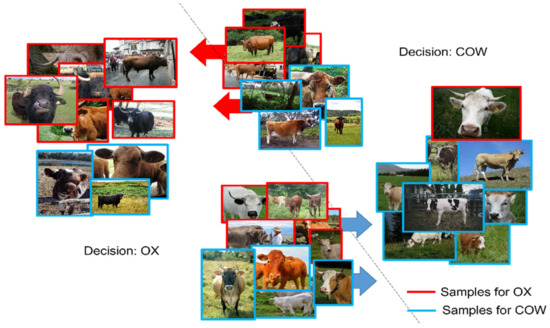 We experimented with ox and cow as an example. Figure 4 shows the ox–cow confusion relationship that can be seen through a simple confusion matrix, and Figure 5 shows the ox–cow confusion relationship drawn through the confusion information dictionary. In both figures, the blue frames represent samples from the cow class, and the red frames indicate samples from the ox class. Model decisions of ‘ox’ are placed on the left side of the figures, and decisions of ‘cow’ are placed on the right side of the figures. Then, in Figure 4, we can observe the samples where the label was ‘ox’, but the model prediction was ‘cow’ and vice versa.