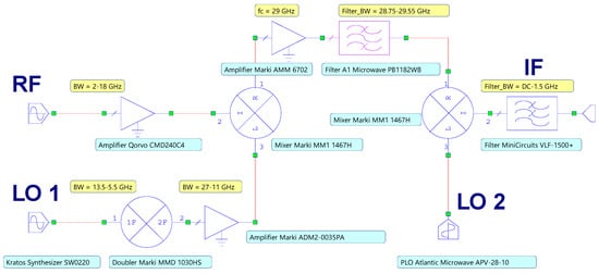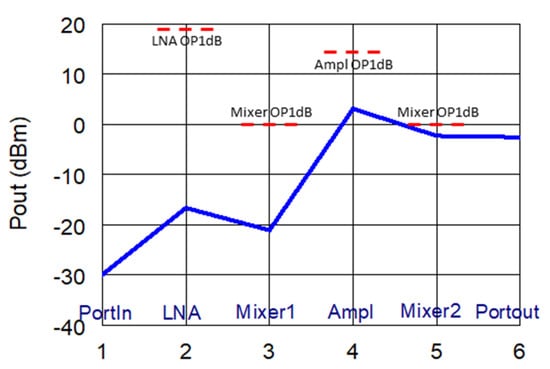 The down-converting chain components were carefully selected by paying great attention at the recommended LO power levels and at matching the dynamic range of adjacent components. The power budget of the down converter with line marks identifying the inter-stage output 1 dB compression points, OP1dB, is reported in Figure 5.