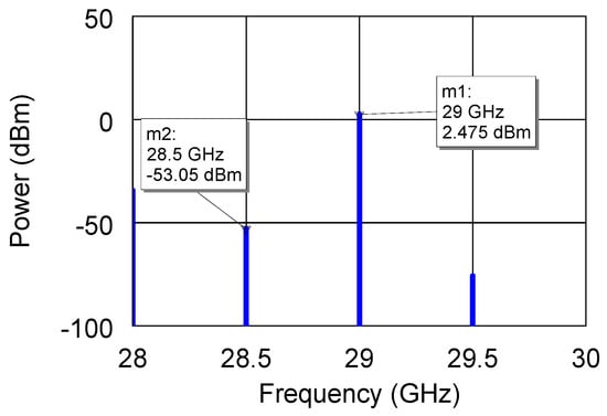 The 2–18 GHz weak received signal is amplified by means of the CMD240C4 low-noise amplifier (LNA) by Qorvo, Inc. Thereafter, the amplified signal is applied to the MM1-1467H mixer by Marki Microwave, Inc., with the aim of performing the signal up-conversion to the 1 GHz bandwidth centered on 29 GHz. This task is accomplished by exploiting the mixer sum output, avoiding too high LO signals and, thus, the use of highly expensive components or multiple multiplication stages, which would dramatically increase the spurious number. The LO generation is addressed by injecting the 13.5–5.5 GHz signal generated by a SW0220 microwave synthesizer by Kratos Defense and Security Solutions, Inc. into a frequency doubler stage MMD 1030HS by Marki Microwave, Inc. The obtained 27–11 GHz signal multiplied by the 2 18 GHz input allows us to obtain a 29 GHz sum frequency with minimum spurious generation. Thereafter, the up-converted signal is amplified by the AMM 6702 amplifier by Marki Microwave, Inc. and filtered by means of the PB1182WB bandpass filter by A1 Microwave Ltd. within the bandwidth of about 1 GHz. The power spectrum of the signal after the filtering stage is reported in Figure 2, showing how the in-band spurious signals are severely reduced by the effective filtering. The test simulations were performed by considering a sample input frequency of 6 GHz, hence generating a 23 GHz LO signal.