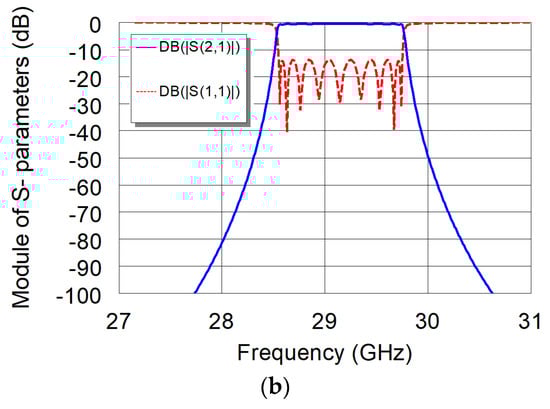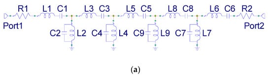 It is worth noting that A1 Microwave Ltd. does not provide the scattering (S-) parameters for the PB1182WB filter; thus, its behavior was synthesized by designing an equivalent lumped-element network. In detail, the main filter parameters were reproduced by implementing a Chebyshev topology by means of the well-known insertion loss method, which allows for a high degree of control over the in-band and stopband amplitude and phase characteristics []. A nine-elements network was chosen in order to obtain the desired matching with the real filter performance. In Figure 3a, the filter schematic is shown, while the insertion loss and return loss of the filter are reported in Figure 3b. The excellent matching between the real and reproduced curves might be verified by observing the data reported in the datasheet of the component []. The values of the filter elements shown in the schematic are reported in Table 1.