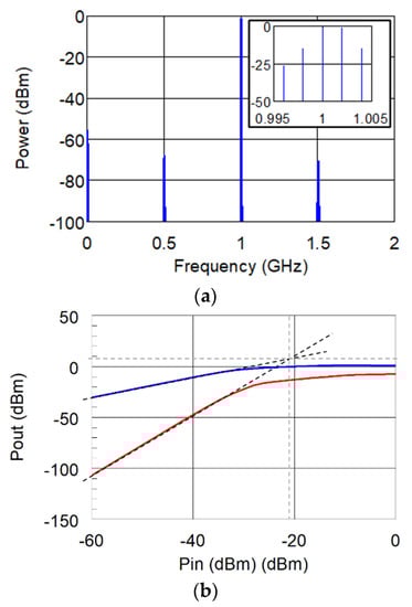 A two-tone analysis was performed to graphically evaluate the intermodulation distortion (IMD) contributions vs. frequency and the , as reported in Figure 7.