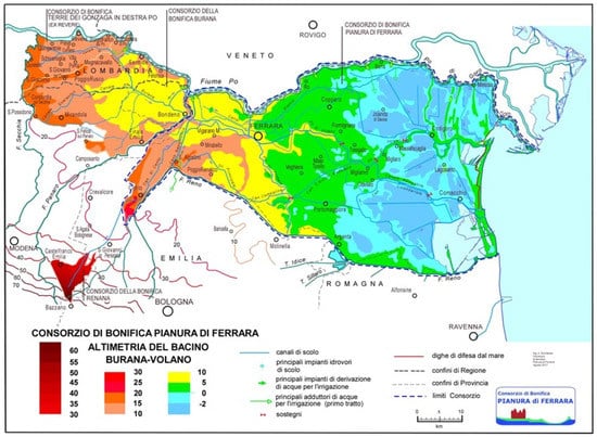 The territory of the province of Ferrara is located at the north-eastern extremity of the Padana Plain, a flat land area in the north part of Italy crossed by the Po River and bathed by the Adriatic Sea on the east side. It is characterized by minimum land slopes and its altimetry is mainly under the mean sea level, as almost half of its area is below the mean sea level, as shown in Figure 1. Moreover, the eastern part of the territory is affected by subsidence phenomena as well. These ground-level modifications, caused mainly by anthropogenic actions as well as by geological and neotectonic factors [,], produced a subsidence rate of up to −2.5 mm/year []. The main watercourses that flow through the Ferrara province are the Po River, which marks the northern border of the Reno River, and the Idice and Sillaro streams, which are not tributaries of the Po River, and cross the province in their last stretch. Furthermore, numerous artificial canals flow through the Ferrara Province, including the Cavo Napoleonico, which connects the Po and Reno rivers, and the Idrovia Ferrarese.