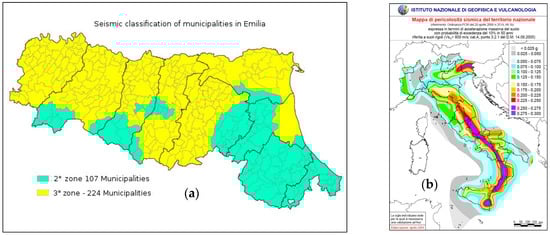 (a) Seismic classification of municipalities in Emilia (https://ambiente.regione.emilia-romagna.it/en/geologia/seismic-risk/seismic-classification, accessed on 26 January 2022). (b) Seismic Hazard Map of Italy (free source from INGV webpage http://zonesismiche.mi.ingv.it/, accessed on 26 January 2022).