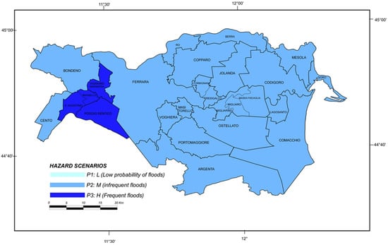 Both flood and seismic risks have been included in PROMETHEE as criteria according to their components (hazard, exposure, and vulnerability), while the municipalities, i.e., the object on which to evaluate the criteria, are the alternatives. Risk parameters for each municipality are made available by the National Institute of Vulcanology and Geophysics (INGV), the Italian National Institute of Statistics (Istat), and the Land Reclamation Authorities of the Province of Ferrara. Accordingly, we have drawn from the aforementioned databases a simplified map of the flood risk. In particular, Figure 3 displays the flood hazard for the Province of Ferrara in terms of the probability of floods. In this map, the classification is based on Italian Government Decree n. 49/2010 []. Accordingly, frequent floods are defined as those having a high probability of occurrence, with a return period of 20 ≤ T ≤ 50 years (P3); infrequent floods have an average probability of occurrence with a return period of 100 ≤ T ≤ 200 years (P2); finally, low-probability floods have a return period of 200 < T ≤ 500 years (P1).