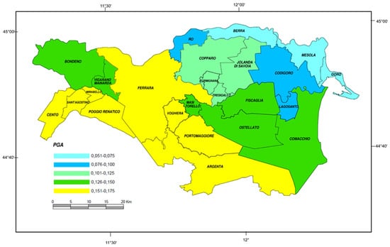 Figure 4 provides a map of the seismic hazard for the province of Ferrara in terms of peak ground acceleration (PGA). The PGA-intervals are indicated in the legend.