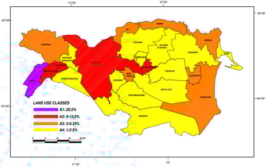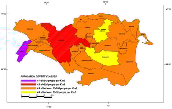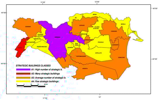 As for exposure-related criteria, for each municipality, we adopted three parameters: Land use percentage, the number of strategic buildings, and population density. All of them were drawn from the Istat database. The strategic buildings were defined based on the presence and number of halls, police stations, fire brigade buildings, schools, universities, water lifting plants, hospitals, and civil protection centers. This information was obtained from the website of the province of Ferrara (http://www.provincia.fe.it/, 1 October 2021), as per educational and public institutions and centers, and from the website of the Consorzio di Bonifica Pianura di Ferrara as per water lifting plants (https://www.bonificaferrara.it/, 1 October 2021).