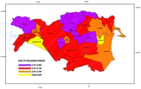 where represent the number of buildings built between the end of 1800 and 1945; the number of buildings built between 1946 and 1980; the number of buildings built between 1981 and 2000, and finally, the number of buildings built from 2001 up to now. are coefficients equal to 1, 0.75, 0.5, and 0.25, respectively. The vulnerability index Iv results in being mainly related to the age of buildings, and its map is shown in Figure 8.