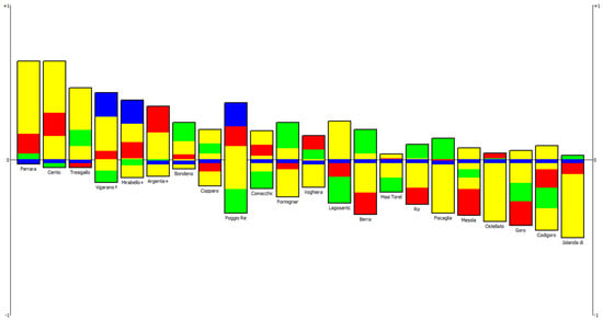 This is not the only way to visualize the results: The PROMETHEE rainbow plot, shown in Figure 9, allows one to highlight, for each alternative, the criteria that positively or negatively affect the results. In Figure 9, the colors are representative of the criterion: Yellow indicates the criteria relating to exposure, red is used for seismic hazard, green for vulnerability, and blue for flood hazard. For example, for the municipality of Ferrara (first in the ranking), it can be observed that the criterion that has a negative effect is the one relating to the flood hazard, whereas the other criteria have a positive effect on the Ferrara municipality. On the contrary, in the municipality of Jolanda di Savoia (last in the ranking), the only criterion that has a positive influence is the one relating to vulnerability, while all the others have a negative influence.