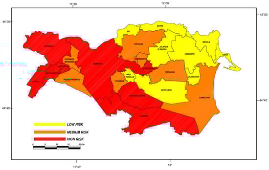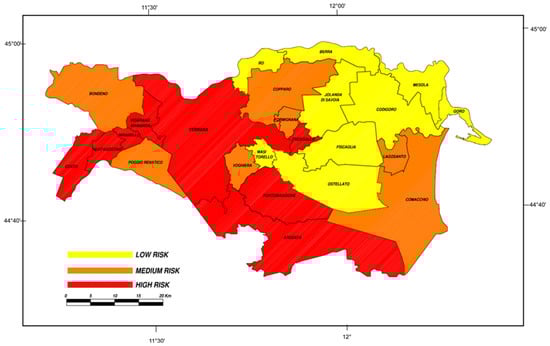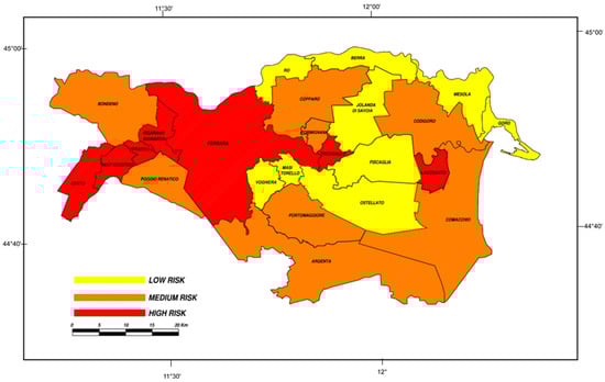 Regardless of the preference function chosen, the maps obtained present a similar risk trend, i.e., the territory is divided into two parts: The municipalities of the western part of the territory of the province of Ferrara, plus Ferrara and Tresigallo, are characterized by a medium–high risk level; the upper-eastern part of the province is characterized by a medium–low risk level.