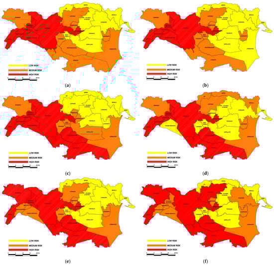 Weights sensitivity analysis, multi-risk maps; (a) flood hazard weight increase assuming Scenarios 2 or 3; (b) PGA weight increase assuming Scenario 1; (c) PGA weight increase assuming Scenario 2; (d) land use weight increase assuming Scenarios 2 or 3; (e) strategic buildings weight increase assuming Scenario 1; (f) strategic buildings weight increase assuming Scenarios 2 or 3. The risk levels strictly indicate the relative priority ranking for decision-makers and do not indicate the effective safety level of the various municipalities.