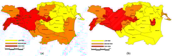 Weights sensitivity analysis, multi-risk maps; (a) Scenario 2, population density weight increase; (b) Scenario 3, population density weight increase. The risk levels strictly indicate the relative priority ranking for decision-makers and do not indicate the effective safety level of the various municipalities.