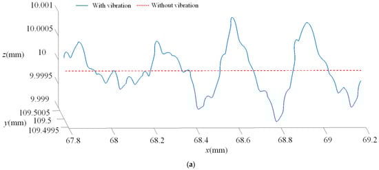 In order to investigate the effect of milling vibration on cutting posture of the milling cutter, the bias angle and the trajectory of milling cutter with/without vibration were compared by using Equations (1)–(10), as shown in Figure 2.