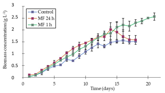 - Santos, L.O.; Deamici, K.M.; Menestrino, B.C.; Garda-Buffon, J.; Costa, J.A.V. Magnetic treatment of microalgae for enhanced product formation. World J. Microbiol. Biotechnol. 2017, 33, 169–172. [Google Scholar] [CrossRef]