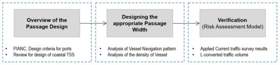 In this study, in order to calculate the appropriate width for an offshore transportation network route, the current status of coastal ships in Korea and the current status of the planned construction of offshore marine wind farms were analyzed. Based on the traffic status, an appropriate route width was designed using a maritime traffic safety evaluation model. For this, the standards and cases of general route design width were investigated, and an appropriate range was selected. After analyzing the traffic density and vessel operation patterns for the target sea area, a risk evaluation was conducted to determine the appropriate route width for the vessel traffic volume using the traffic safety evaluation model. Figure 1 shows the flowchart of this study.
