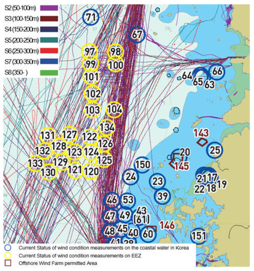 In order to build an offshore wind farm, the wind conditions must be measured for one year and a wind turbine can be built within a range of 10 km for each instrument []. Currently, in the coastal waters of Korea with depths below 200 m, wind condition gauges are installed and there are many planned installation sites.