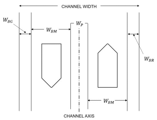 As shown in Figure 3, the required channel width of a one-way channel for the bottom width of the harbor and access channel is calculated using Equation (1):