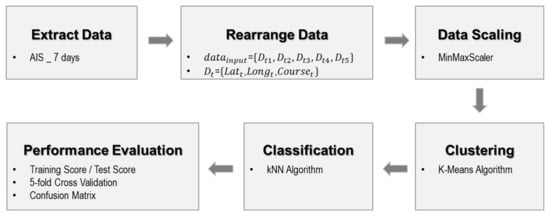 In this study, vessel traffic patterns were analyzed based on the maritime traffic status in the target sea area. A method for identifying and classifying vessel navigation patterns that involved learning a vessel’s trajectory pattern and clustering the accumulated trajectory data was used. However, this method can be applied to ships with a certain pattern, and it is difficult to derive valid results for ships that do not maintain a constant pattern, particularly for small ships such as fishing boats. Since small ships are rarely restricted by water depth when navigating to reach their destination and do not set a specific change point and angle when establishing a voyage plan, the same voyage route is not maintained even if they travel to the same destination and will change depending on the environment []. Therefore, in this study, pattern analysis using machine learning was performed on ships with patterns of 50 m or longer. The model used for the trajectory pattern learning is shown in Figure 5.