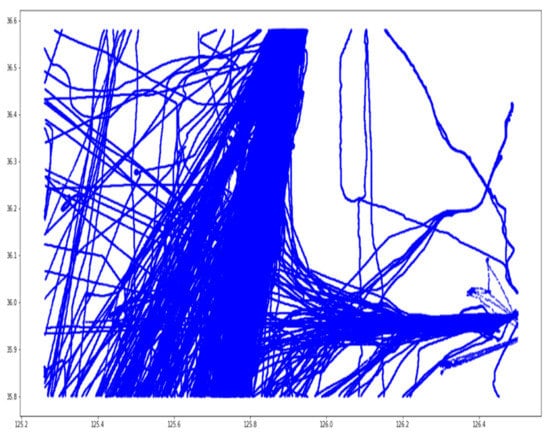 The first step in the ship navigation pattern clustering process is the extraction of learning data. In this step, AIS data were extracted for seven days and used as target data. Since data are received at random, five points of data were grouped into one group according to the order of data reception. As shown in Equations (3) and (4) below, the three pieces of information of latitude, longitude, and course in the order of time were considered as one set, and each set of 5 data points was used to generate data with 15 dimensions. The extracted AIS data are shown in Figure 6.