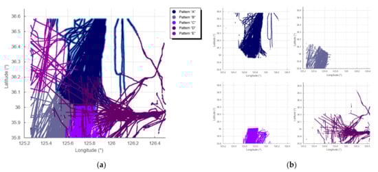 (a) Comprehensive result of the vessel trajectory pattern analysis; and (b) A~D classification vessel trajectories for each pattern.