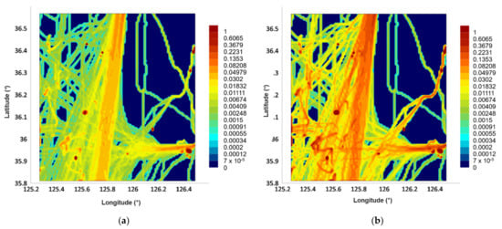 The density analysis results for the target sea area are shown in Figure 8. In (a), which calculates the frequency of fairway within the gridded sector per unit time (1 s), the high-density section was found to be about 5 to 6 km. On the other hand, in (b), where the density was calculated in consideration of the area occupied by passing vessels, it was determined that the section with a high density appeared as wide as 10 km or more.