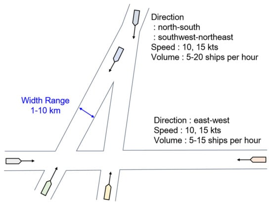 There are many studies focusing on the design of fairways. Although some research on fairway design using autonomous navigation or AI has been carried out recently [,], many studies on fairway design, including fairway width, have already been conducted. However, most studies have focused on the design of the fairway width for ports taking into account the approaching waters or bandwidth of fairways [,,], and there are few studies or design standards on the appropriate fairway width for coastal fairways such as TSS in coastal waters [].