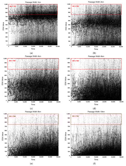 The Environmental Stress Model (ES model) is a model developed to quantitatively evaluate the degree of load applied to the ship operator due to the environment surrounding the ship. Here, the surrounding environment is divided into a traffic topographic environment and a ship navigation environment. The ES model is expressed as a stress value felt by the ship operator according to the time margin for the bearing/distance of obstacles in the range of ±90 degrees and the course/speed of the ship based on the course of the ship. The degree of environmental stress that a ship operator receives is called “Environmental Stress value”. The environmental stress value is composed of “ES value for Land (ESL)”, which is the amount of stress caused by the vessel operating environment, such as terrain or facilities, and “ES value for Ships (ESS)”, which is the amount of stress caused by other ships. The two stress values are collectively referred to as “Aggregation of ES value (ESA)”. ES stretch is classified into 4 levels (0–500, 500–750, 750–900, 900–1000). If the stress value is 750 or more, this is determined to be an acceptable limit, and if it is 900 or more it is determined to be unacceptable. In this study, the ESA value was used to evaluate the risk between ships and the risk caused by operation within a limited route. To calculate the ES value, you must first calculate the risk for the relative distance between ships in relation to the collision (SJ) value [,,].