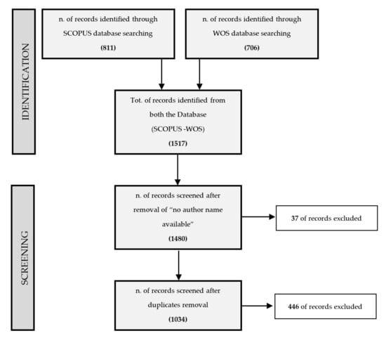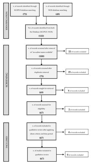 Figure 1 below shows the number of retrieved publications related to BIM-FM. In the sequence, Figure 2 shows the breakdown of the papers included in the review after applying the research protocol. Initially, 1517 records were collected and 483 were excluded. Therefore, a preliminary investigation outlines that 1034 publications discuss BIM in facility management; among them, only a minor part treats the subject in the public field. Thus, to address the study’s objective, 122 publications were reviewed for the analytical investigation in the second stage: from 122 identified entries, 67 were considered eligible for further analysis after the screening process.