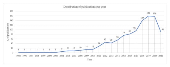 The Scopus Database, coupled with the Web of Science, was considered as appropriate for this study since it provides relevant scientific publications on the theme. Therefore, two rounds of research were performed. Firstly, the keywords and Boolean operators used to select publications of interest included “BIM, Building Information Model*” AND “FM, Facilit* Management”. The first round, depicted in Figure 1, generated an overview of BIM-FM research within the studied period and initial insights regarding the industry inclination towards BIM-FM implementation. The period set for this step was 1988 to 2021 to identify early publications related to BIM-FM. Subsequently, in round two, the keyword “public” was added to the screening process, and the period was constrained to 2010 to 2021. This round was relevant for identifying key contributions related to the public sector and generating comparisons between public and private BIM-FM implementation. Round two steps are presented in the Prisma flow diagram (Figure 2).