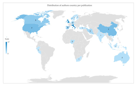 The authors are predominantly from Italy (17.17%) and the UK (14.14%), followed by China and USA (7.07% each). Approximately 45.45% of the total number of publications are distributed among these territories, whereas the remaining countries present fewer than five studies each, demonstrating research opportunities on the topic in those regions.