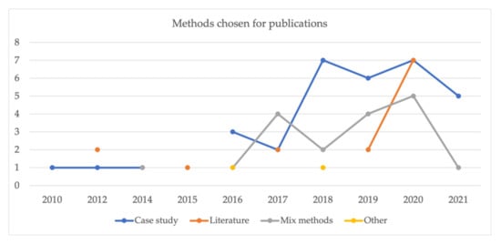 The last element explored within the bibliometric analysis was the research methods used to investigate BIM-FM in the public domain. Three research strategies are predominant in the sample analysed: case study research, literature reviews and mixed methods approach. Case study research is adopted in 33 of the research works, followed by the other two categories (literature and mixed methods), which count approximately the same number of studies (32). The distribution of research articles according to their research method is shown in Figure 6.