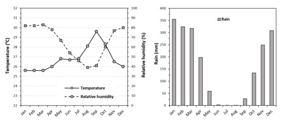 In this study, different passive cooling techniques were evaluated, individually and combined. The techniques were implemented in a test cell, located in the city of Palmas, Tocantins, Brazil, and the thermal conditions inside it were measured over time using temperature sensors. The effectiveness of each technique, applied individually or combined, was evaluated by comparing the temperature variations inside the cell where they were implemented, with the temperatures inside another geometrically identical cell, used a control. The external climate was characterized using data from the Palmas Meteorological Station [24]. The climate of Palmas-TO is labeled as Aw according to Köppen-Geiger classification. Figure 2 shows the typical annual ambient conditions of Palmas, Brazil.