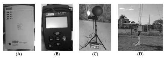 Equipment used: (A) Temperature sensor; (B) CO2 concentration meter; (C) Black globe thermometer; (D) INMET Meteorological Station.