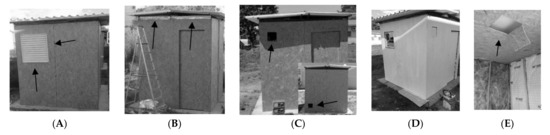 In campaign 1, the shading of the glazed opening was implemented through a shutter-type aluminum frame (0.8 × 0.8 m2), painted with white paint and fixed on the window of cell C1 (Figure 5A). In campaign 2, a low-emissivity reflective film was applied between the OSB ceiling and the thermo-acoustic tile covering of cell C1 (Figure 5B). In campaign 3, natural cross ventilation was ensured, due to the effect of the wind. For this purpose, two openings were made in cell C1, measuring 20 cm × 20 cm each, one of them being located in the lower part of the east façade and the other in the upper part of the west façade, to guarantee their orientation to the prevailing winds (Figure 5C). In campaign 4, white reflective paint was applied on the outer faces of the four walls and on the roof. The application was carried out with three coats, according to the manufacturer’s instructions (Figure 5D).