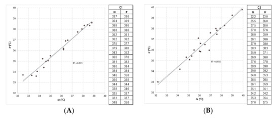 For this study, four temperature sensors (two in each cell) were used. They were positioned in the center of the cells, one meter above the floor. The equipment has an accuracy of ±0.35 °C for temperature and ±2.5% for relative humidity [25]. Records were recorded every 10 min (Figure 4A).