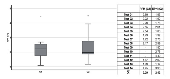 Figure 8 shows the air change rate per hour (RPH) in cells C1 and C2 resulting from performing 11 and 14 measurements, respectively. The results show some variability, not only when comparing the punctual values obtained for the different measurements, but also when evaluating the mean values for the two cells (2.29 h−1 for C1 and 2.42 h−1 for C2). However, the variability obtained was expected, since measurements carried out by other authors, using the same technique and CO2 as the tracer gas, point in the same direction [21]. For the reasons previously presented, it was considered that the obtained differences were acceptable. The very high values obtained in this test suggest the existence of significant infiltrations in the cells, probably due to the lack of sealing of the connecting joints between the walls and the ceiling.