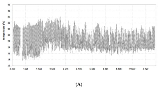 Figure 9 shows the variation of outdoor temperature and relative humidity during the experimental campaign. The average outdoor temperature was 27.2 °C, with a maximum of 39.5 °C and a minimum of 17.1 °C, as shown in Figure 9A. The relative humidity shown in Figure 9B ranged between 13% and 95%, with an average of 65.3%. Radiation reached a maximum amount of 1081 W/m2 (Figure 10B) and wind speed reached a maximum value of 9.1 m/s, with an average value of 1.29 m/s (Figure 10C). As for the wind direction, it was mostly oriented to East-Northeast, followed by the East, Northeast and North-Northeast, corresponding those directions to 40.0% of the measurement period (Figure 10A). The lack of values in Figure 9 and Figure 10 resulted from failures in measurements by the meteorological station’s sensors.