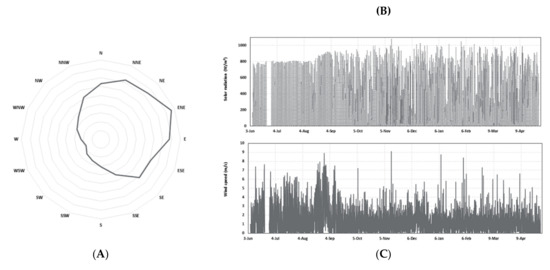 Outdoor climate: (A) Wind direction; (B) Solar Radiation; (C) Wind Speed.