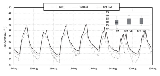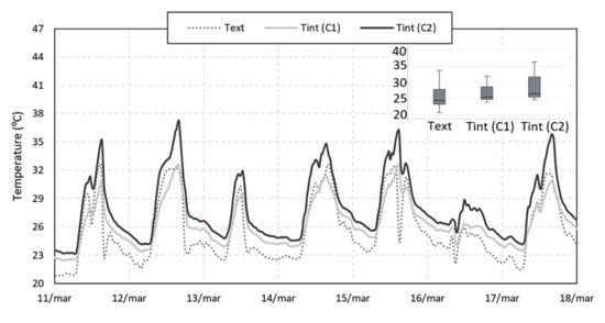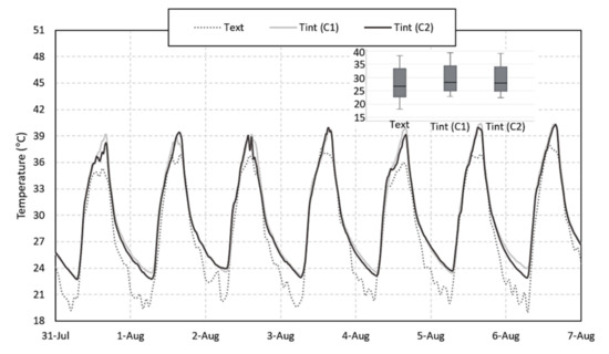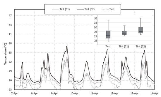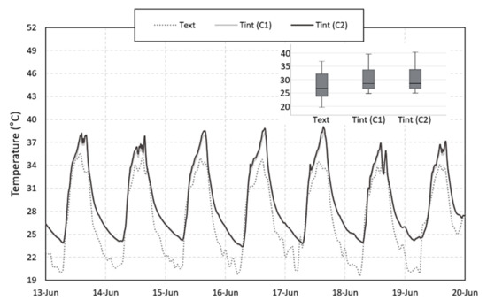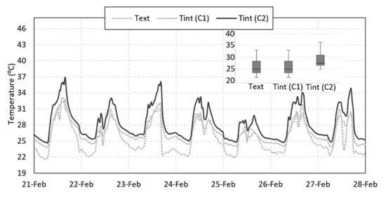 The temperatures measured inside the cells when the shading of the glazed opening in cell C1 was on are shown in Figure 11, with the highest value occurring in the control cell C2 (40.4 °C). Cell C2 had a mean temperature higher by 0.2 °C when compared to cell C1, and both cells had maximum, mean and minimum temperature values higher than the external temperature. In cell C1 a small gain in cooling was obtained, as there was a decrease in maximum daily temperatures. This result is not very expressive due to the small glazed area. However, with the use of this technique in larger glazed areas and on different facades, it is believed that its effect would be enhanced, as also shown by other authors [31,32].