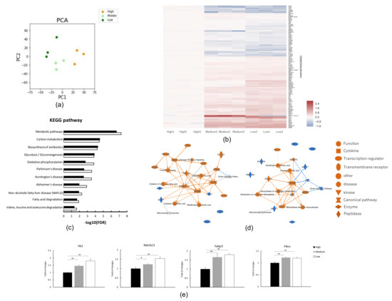 C2C12 myotubes were cultured in Low (1.0 g/L), Medium (2.0 g/L), and High (4.5 g/L) glucose media. At 5 days post-differentiation, proteome analysis was performed to examine the intracellular dynamics of the C2C12 myotubes at different glucose concentrations in the culture media (Table S1). Principal component analysis (PCA) revealed three clusters of High, Medium, and Low groups (Figure 1a). The contribution ratio of PC1 and PC2 are 0.27 and 0.14, respectively. The p-value was corrected by empirical Bayes method. In total, 113 proteins were identified as differentially expressed proteins with statistical significance (q < 0.05) and were classified by their expression patterns into two major groups (Figure 1b). Compared with High, Low and Medium showed similar protein expression patterns. Comparison between Low and Medium did not show any statistically significant difference. The differentially expressed proteins were analyzed by KEGG pathway and IPA analysis (Figure 1c,d). The KEGG and IPA results showed that glycolysis, oxidative phosphorylation, and fatty acid metabolism were increased in the Medium and Low groups compared to the High group. It is noted that PPARGC1A was suggested as an upstream regulator in Medium condition (Figure 1d). Specifically, in the Medium and Low groups, the glycolytic pathways included hexokinase 2 (HK2), which catalyzes the reaction of glucose-to-glucose hexaphosphate, and phosphofructokinase (PFKP), which catalyzes the reaction of fructose hexaphosphate to fructose 1,6-bisphosphate was increased (Figure 1e). Moreover, the expression of NDUFA11, a subunit of mitochondrial complex 1 of the electron transport system [14], and the expression of FABP3, which is involved in the intracellular transport of fatty acids [15], were also increased (Figure 1e). Proteome analyses suggested that Low or Medium glucose media induces the metabolic change.