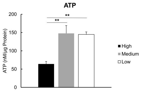 ATP levels in C2C12 myotubes under Low, Medium, or High glucose conditions. ATP levels were determined in C2C12 myotubes under Low, Medium, or High glucose conditions (n = 3, each group). ** p < 0.01.