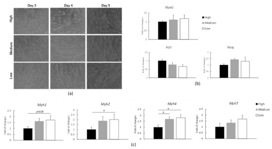 Myofibers consist of slow and fast muscle fibers, which are classified by fiber type specific Myh proteins, and muscle fiber types are also characterized by different metabolic properties: Myh7/MyHCI, slow-oxidative; Myh2/MyHCIIA, fast-oxidative; Myh1/MyHCIIX, fast-glycolytic; Myh4/MyHCIIB fast-glycolytic [1]. Our proteome analysis revealed that Myh1/MyHCIIX and Myh8/MyHC perinatal were identified as differentially expressed proteins, which are increased in Low and Medium conditions compared with High condition (Figure 1c). To analyze the myosin composition under induced metabolic changes, the expression levels of each myosin isoform at 5 days post-differentiation were confirmed by qRT-PCR (Figure 3c). Myh2 and Myh4 were significantly upregulated in Low and Medium conditions compared with High condition. Myh1 isoform in the Low and Medium groups also showed an increased trend compared to the High group (p = 0.09). These results indicate that growth of C2C12 myocytes at Low and Medium glucose concentrations in culture media result in tendency to increase in myosin isoforms at transcriptional level.