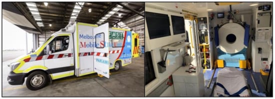 In the event of an acute ischemic stroke, the blood supply is occluded in the cerebral blood vessels, thus causing cerebral infarction which may lead to severe neurological impairment and even death [1]. Studies have shown that thrombolytic treatment is feasible and effective in treating patients with acute ischemic stroke using tissue plasminogen activator (tPA), which is the only thrombolytic drug approved by the Food and Drug Administration (FDA) and, correspondingly, therapeutic goods administration (TGA) [2]. However, the administration of tPA requires a prior brain scan via a CT scanner to determine the suitability of such medication, and its usage is generally constrained to a time window of up to 4.5 h (or up to 9 h with CT-perfusion selection to detect potentially reversible ischemia) after the onset of stroke, where its effectiveness decreases as time progresses [3]. Due to its highly time-sensitive nature, earlier stroke treatments should be enforced to improve the likely patient outcome, where ideally treatment should be administered within the first hour after the onset of stroke symptoms—the ‘golden hour’ for the best recovery result [4,5]. In order to treat such disorders in large countries where the community is sparsely located away from hospital services, alternative avenues are being assessed. One such avenue is a mobile stroke unit.