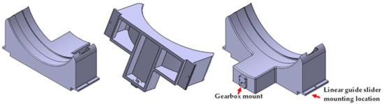 In order to house the modified gantry of CereTom within the AW189, the default caterpillar tracks along with an individual stepper motor attached on each side may be replaced with a ball screw mechanism to reduce the bulkiness of the structure while maintaining a high-precision translation, where a support structure was implemented with its geometrical features designed according to a ball-screw-driven linear guide system. To size the support structure for the modified gantry of CereTom, the maximum allowable design space was confined to the default width and depth of CereTom, which are 134 cm and 73 cm, respectively, and the cabin height of the AW189, which is 140 cm. A conceptual CAD model of the support structure has been suggested in Figure 8 for the modified gantry, where it has adopted a shell-like geometry to minimize material use and weight.