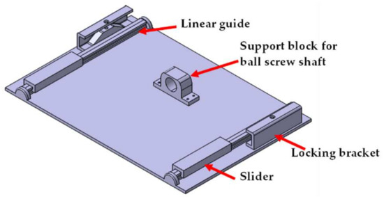 A base plate is designed for two linear guides to be attached, where the plate will be bolted to the helicopter floor accordingly for different helicopter models. A support block will be bolted onto the base plate for mounting the ball screw shaft, and two locking brackets are installed to the sides of the base plate for locking the entire CT scanner in a stowed position (Figure 9).