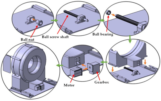 The ball nut is fixed to the support block, then the ball screw shaft is inserted into the support structure, through the ball nut and support block. A motor is then attached to a gearbox, where the gearbox is mounted onto the support structure and attached to the ball screw shaft. The other end of the ball screw shaft will be supported with a ball bearing which is inserted into a hole located inside the support structure. A gearbox with a worm gear and worm wheel is selected to increase the output torque and redirect the transmitted torque perpendicularly; this is to reduce the overall length of the entire CT scanner model. Finally, the modified gantry is mounted onto the support structure via a dovetail joint, where the support structure is secured onto the sliders, which are mounted onto the linear guides (Figure 10).