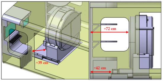 During maintenance, the CT scanner can be controlled to displace forward and fully retract; this creates a space of up to 35 cm between the CT scanner and the adjacent racks for the technician to access the back of the CT scanner and provides a working space of up to 72 cm between the CT scanner and the wall of AW189 (Figure 15).