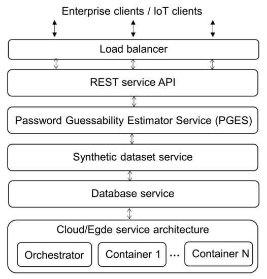 This section presents our modular architecture for our proposed password guessability service. The architecture’s objective is to offer a security service for password security assessment that uses exchangeable components that can grow or change as the companies using the architecture might need. To achieve this objective, we chose a cloud-based infrastructure, given the multiple advantages the cloud offers, and the design offers the functionality as a service, which is a well-used model nowadays on the Internet. First, we describe the design principles behind the proposed architecture, its main components, and finally, the interactions among the components.
