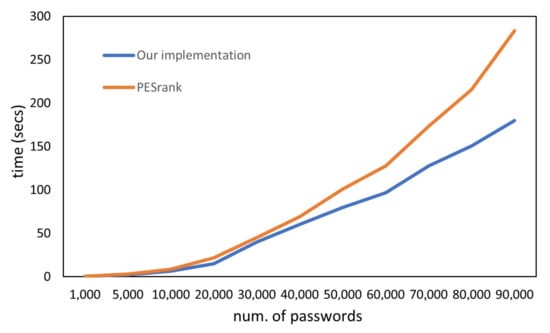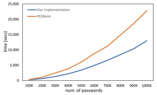 Our password guessability estimator component vs. PESRank (100 k–1000 k). The x-axis represents the number of passwords in the input dataset, while the y-axis represents time in seconds.