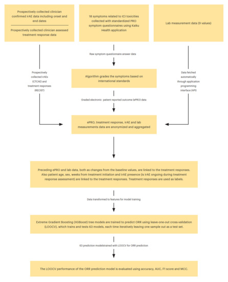 The aim of this study was to investigate whether it is possible to predict objective response rate (ORR) in patients undergoing ICIs for advanced cancers. Thus, pseudonymized and aggregated ePRO symptom data collected with the Kaiku Health ePRO tool, laboratory values, and demographics, in addition to prospectively collected clinician-assessed treatment responses and irAE data, were used to train and tune a prediction model built using an open-source Python library XBoost (extreme gradient boosting algorithm) to assess clinical response to ICI treatment.